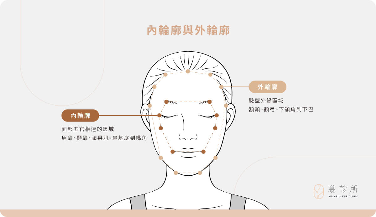 五官由內、外輪廓所組成,內輪廓指的是臉部中軸的立體結構,包括眉骨、顴骨、鼻子、鼻基底等中臉支撐點,是撐起臉部立體度的關鍵。而外輪廓則是臉部的邊界線條,例如額頭、顴弓、下顎角、下巴,決定整體臉型的俐落感與清晰度。