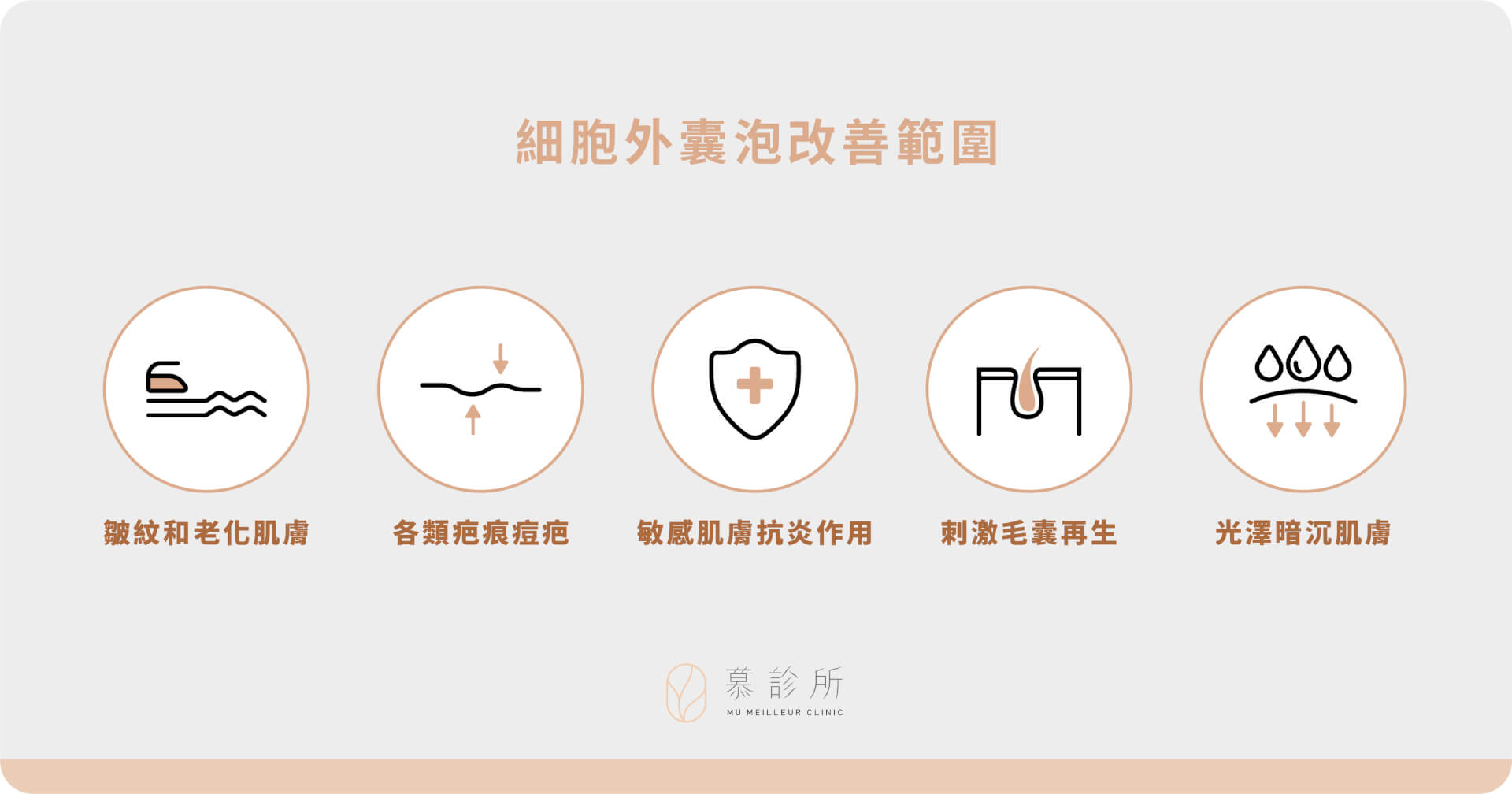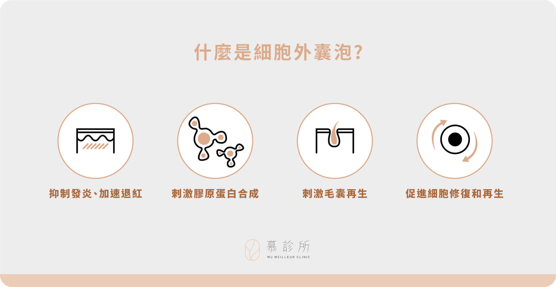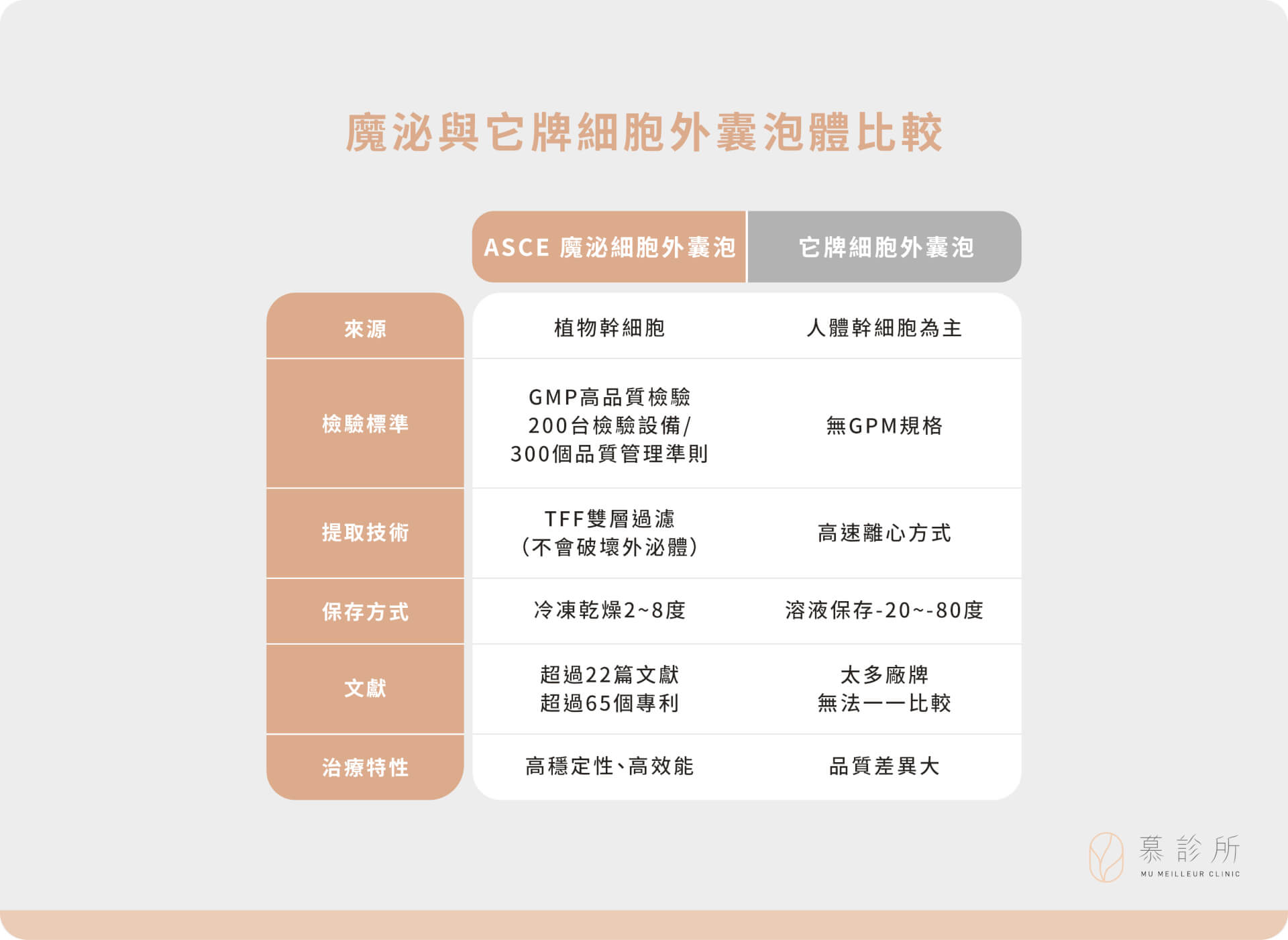 細胞外囊泡治療這兩年在台灣逐漸蓬勃發展,不僅具有顯著的修復能力,還能有效促進老化組織的修復,改善代謝、促進皮膚再生並協助組織修復等治療效果,並改善肌膚修復和毛髮再生。利用強大基因遺傳物質、蛋白質、脂質、生長因子等百寶袋內容物,來防止肌膚迅速老化、舒緩呵護肌膚、提升肌膚晶亮光澤、讓肌膚留住水分。ASCE plus 魔泌作為唯一合法、擁有多項國際專業認證的細胞外囊泡品牌,可被合理運用於皮膚修護的醫美治療當中。