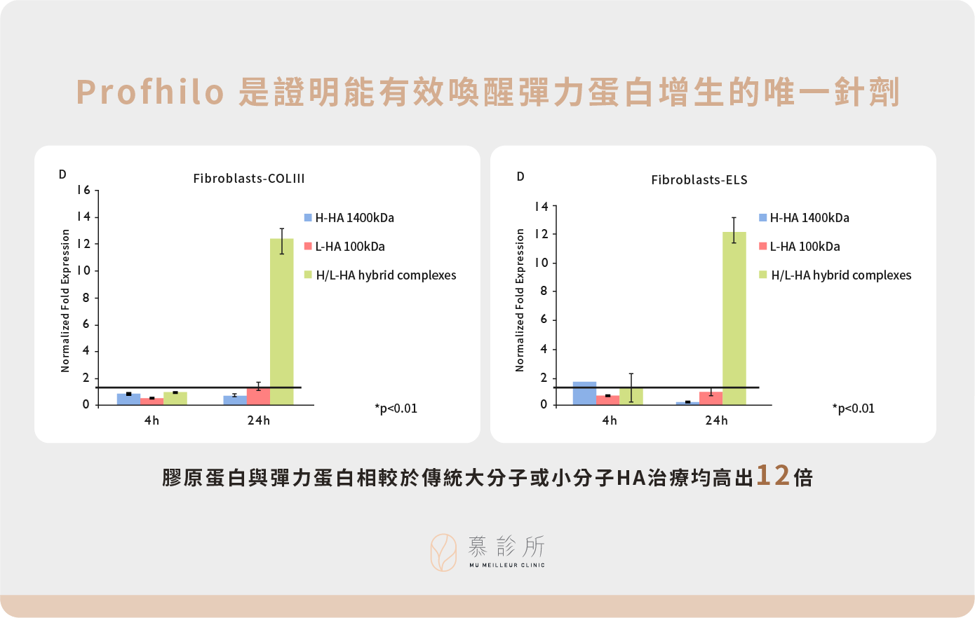 PROFHILO將高分子量與低分子量的透明質酸結合在一起: PROFHILO並不是傳統的填充劑,而是啟動皮膚內部再生機制的產品。研究顯示它能活化皮膚細胞,促進Type I 與 Type III 膠原蛋白,以及彈力蛋白(elastin)的合成。