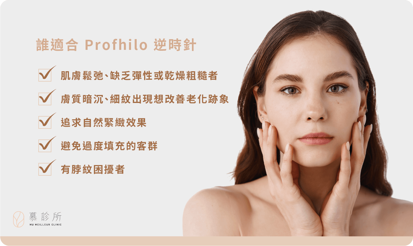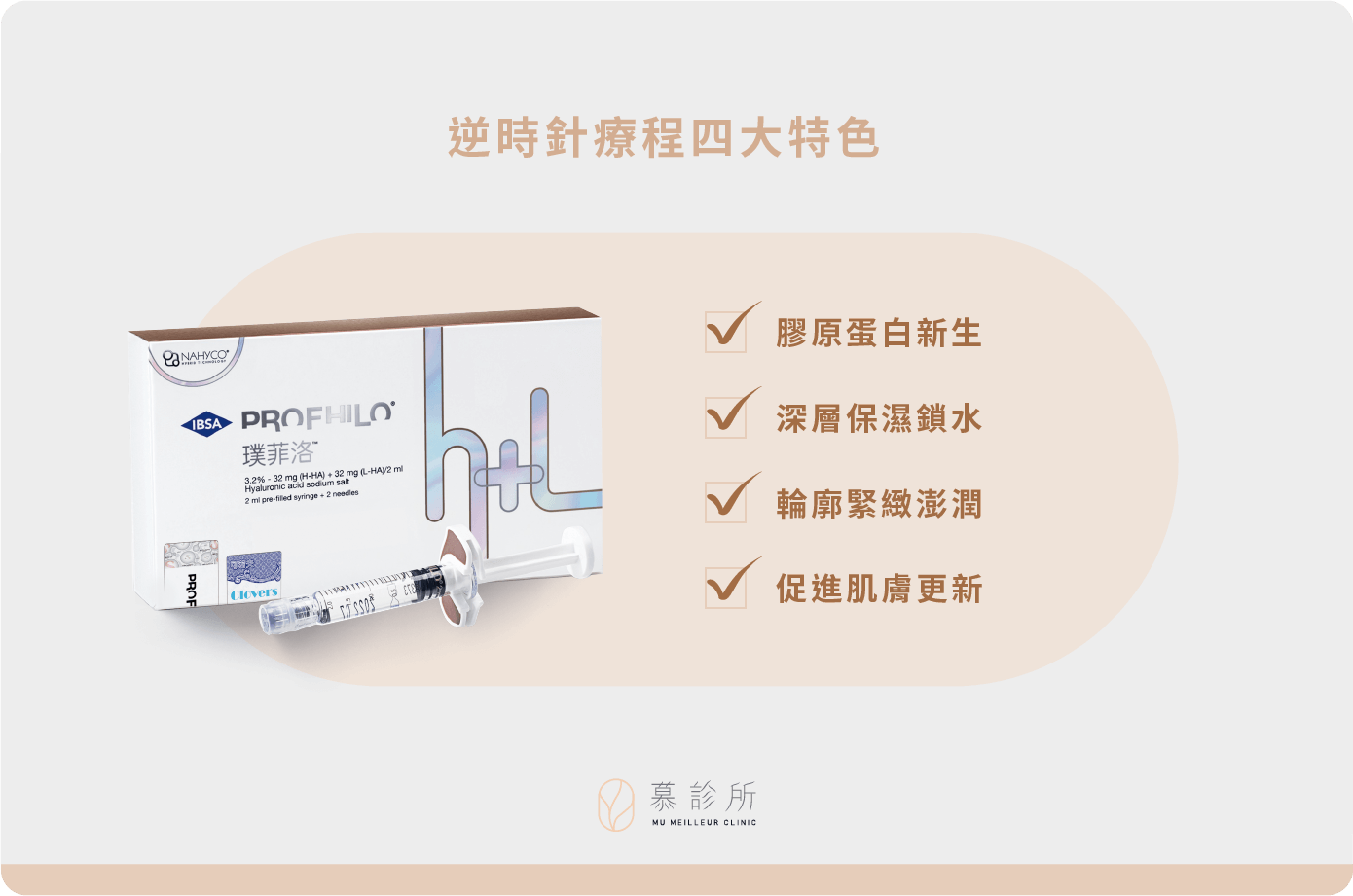 Profhilo 逆時針是一種創新型「肌膚重塑劑」,不同於一般填充型玻尿酸,採用義大利原廠專利 NAHYCO® 技術,將高分子與低分子玻尿酸熱融合為穩定複合物,每 2ml 高達 64mg 高濃度,無需添加交聯劑,質地純淨、親膚性高。臨床研究顯示,Profhilo 可顯著刺激第一型與第三型膠原蛋白,同時促進彈力蛋白生成,活化效果是傳統玻尿酸的 12 倍。不僅改善肌膚乾燥與鬆弛,更從根本提升緊緻度與彈性,實現真正的肌膚重建與自然澎潤。