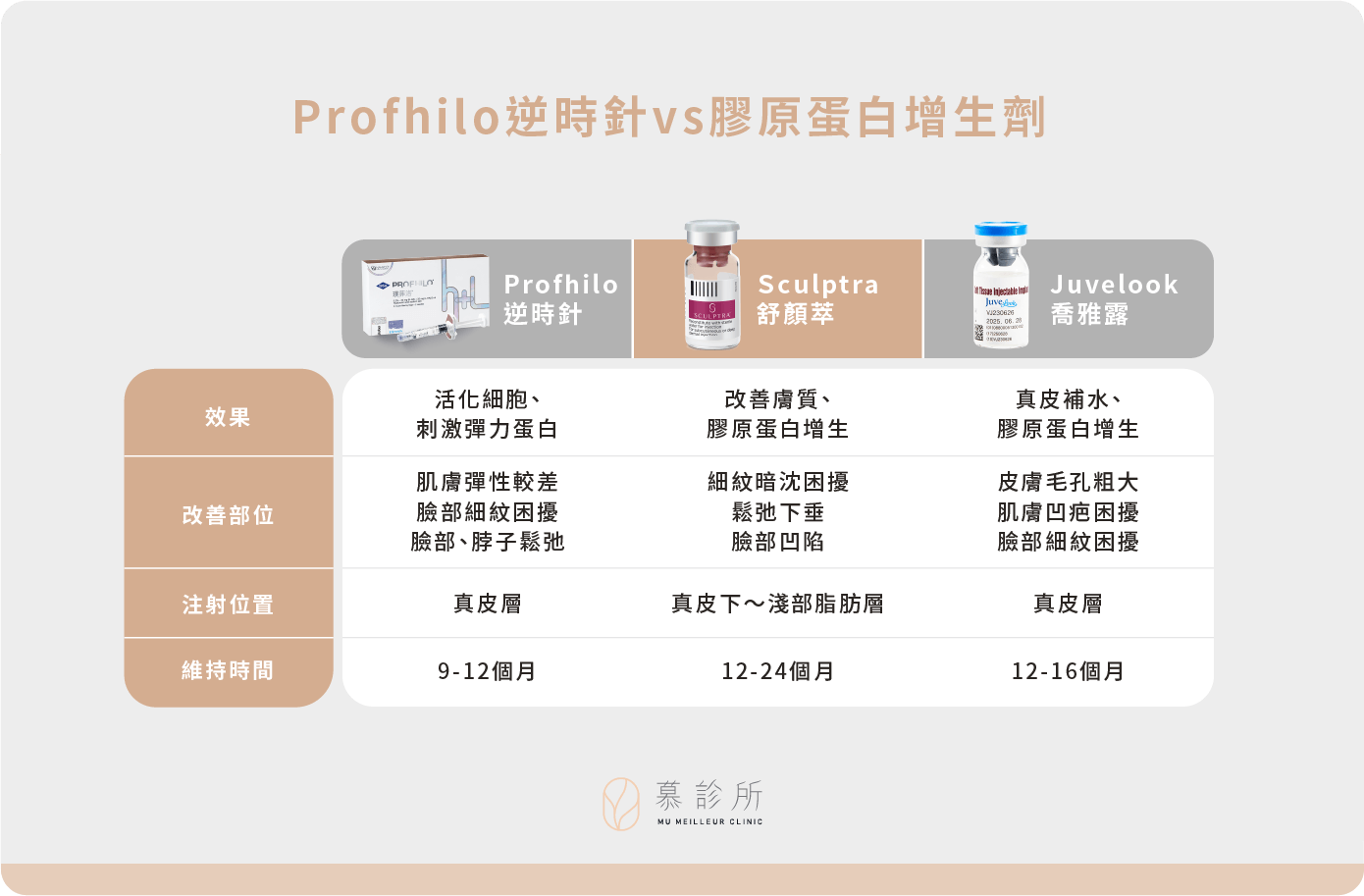 雖然Profhilo逆時針和其他膠原蛋白增生劑都屬於再生醫學療程,都能刺激膠原蛋白,但作用機轉與卻截然不同,針對每一位不同膚況與老化層次皆可以客製規劃。